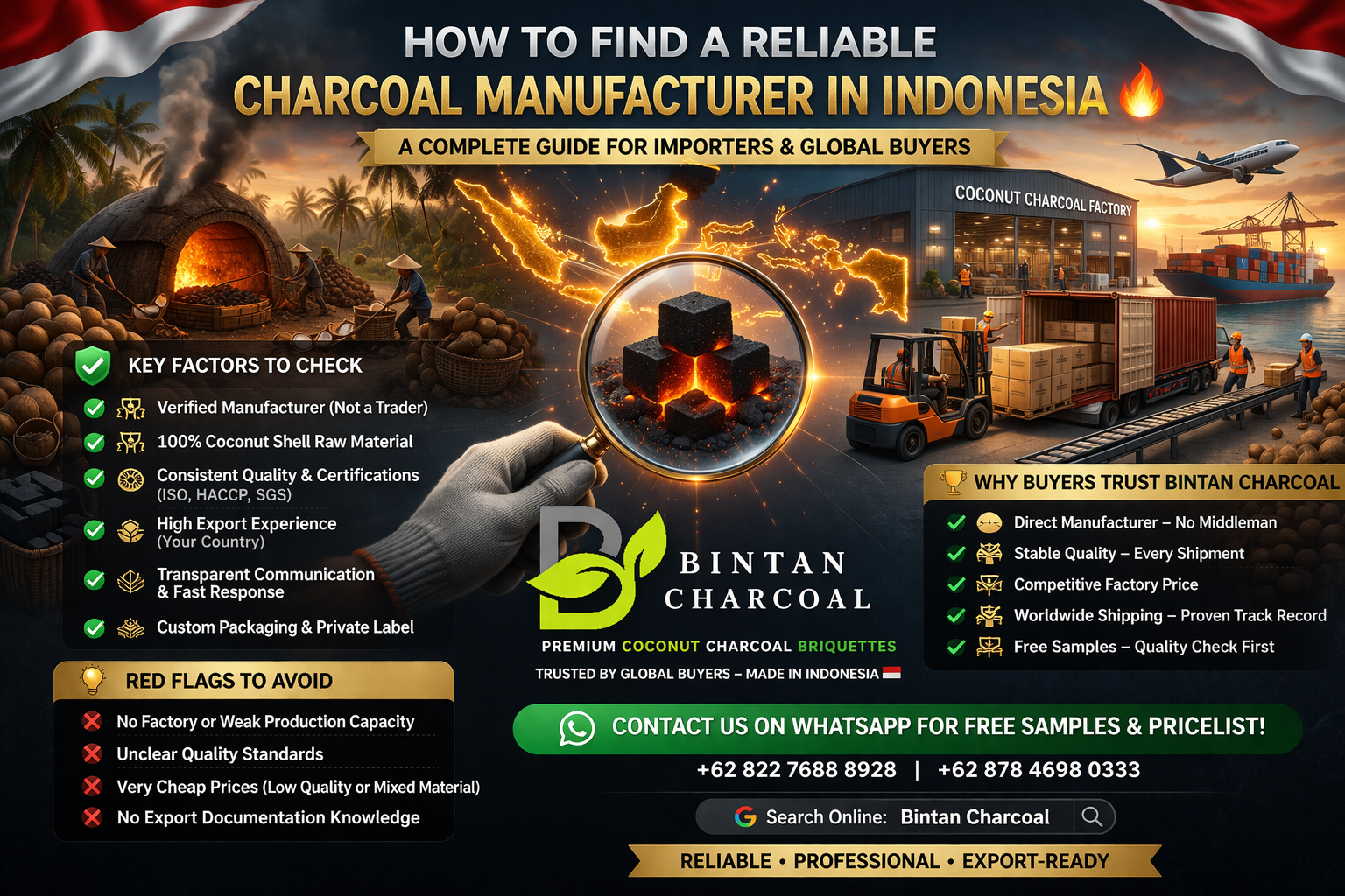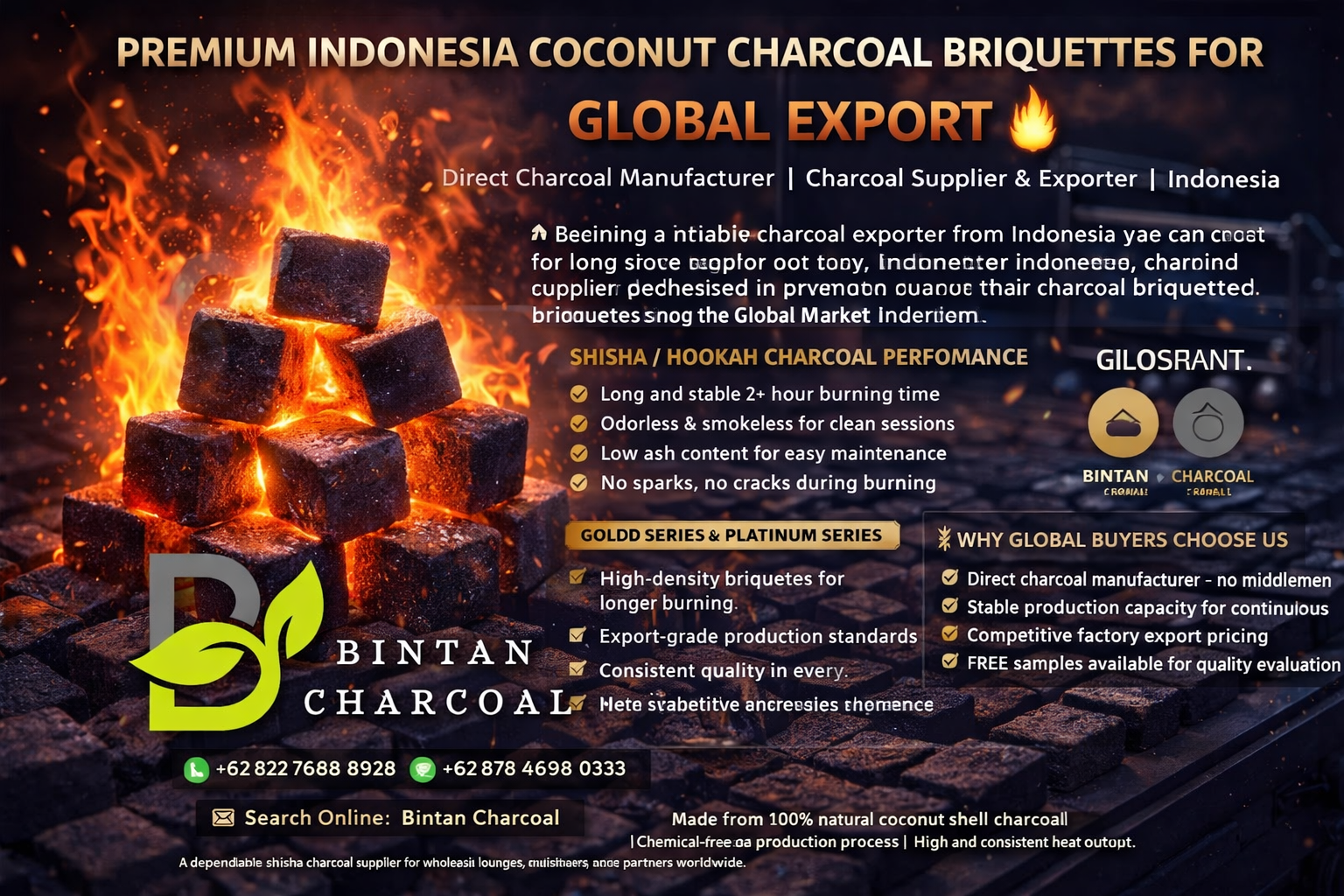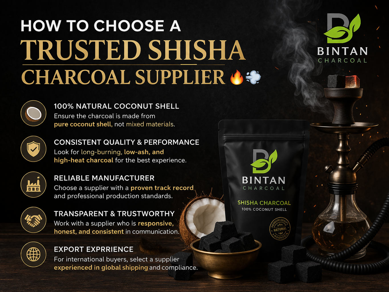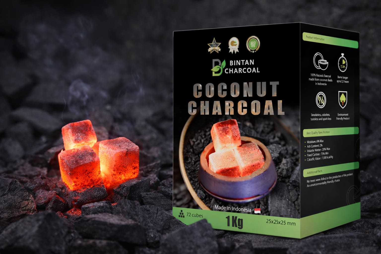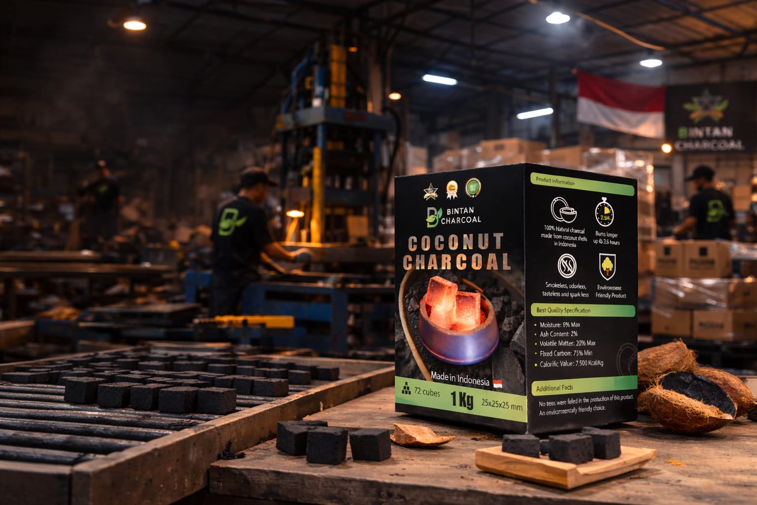 A trusted Indonesian manufacturer and exporter of premium coconut shell charcoal briquettes for Hookah and BBQ.