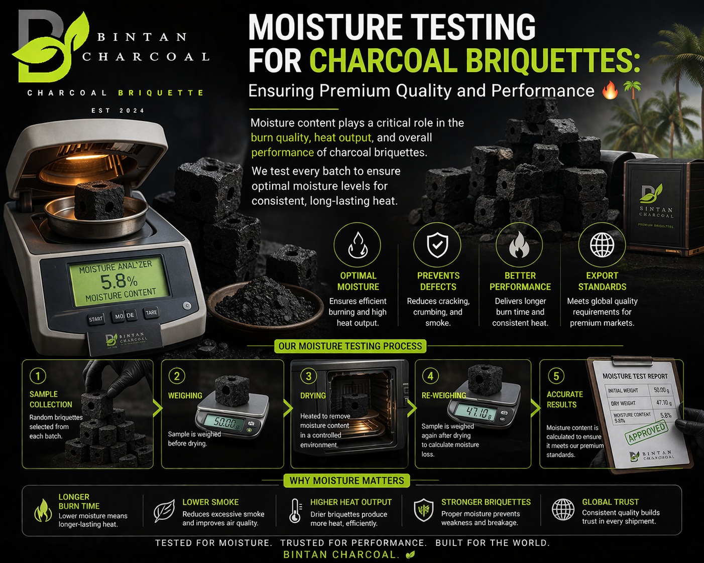 As a trusted charcoal manufacturer and experienced charcoal supplier & exporter, many companies in charcoal indonesia implement strict moisture testing to guarantee that their products meet international export standards.